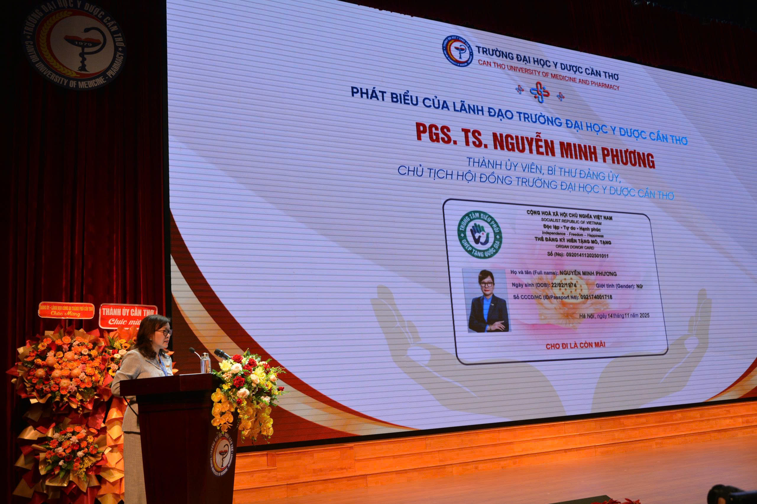 Xúc động phát biểu tại buổi lễ, Thành ủy viên, Bí thư Đảng ủy, Chủ tịch Hội đồng trường Đại học Y dược Cần Thơ, PGS.TS Nguyễn Minh Phương chia sẻ: Tôi đăng ký hiến tạng không phải vì là người đứng đầu mà là vì một điều rất là giản dị, là khi chúng ta rời khỏi cuộc đời này thì chúng ta phải còn cái gì đó để lại. Và tôi tin rằng, dù chỉ là một cá nhân nhỏ bé của mình hoặc tất cả cúng ta ở đây thì chúng ta cũng thắp lên một phần nào đó sự động viên an ủi cho gia đình cũng như cho cuộc đời còn ở lại.