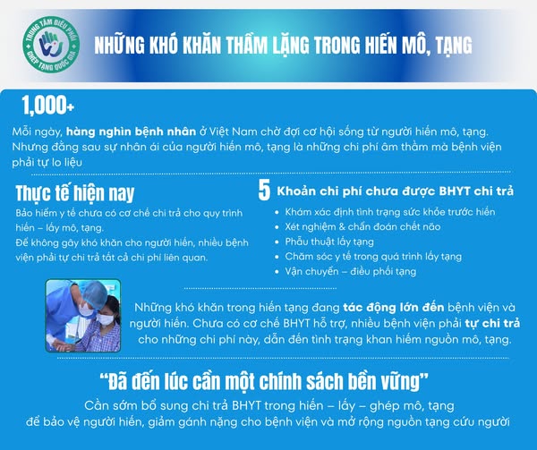 Theo quy định hiện hành, bảo hiểm y tế chưa chi trả cho các khoản chi phí của quy trình hiến mô, tạng. Điều đó có nghĩa là những chi phí sau đây chưa có nguồn chi trả chính thức: Khám sức khỏe để xác định đủ điều kiện hiến; Xét nghiệm, chẩn đoán chuyên sâu; Phẫu thuật lấy tạng; Chăm sóc y tế trong quá trình lấy tạng; Vận chuyển tạng giữa các bệnh viện. Để không làm ảnh hưởng người hiến, nhiều cơ sở y tế đã phải tự linh hoạt dùng nguồn quỹ nội bộ, hoặc trích chi phí từ các hoạt động khác để bù lại. Đây là sự hy sinh thầm lặng của các bệnh viện – một việc làm nhân văn, nhưng không thể kéo dài mãi.